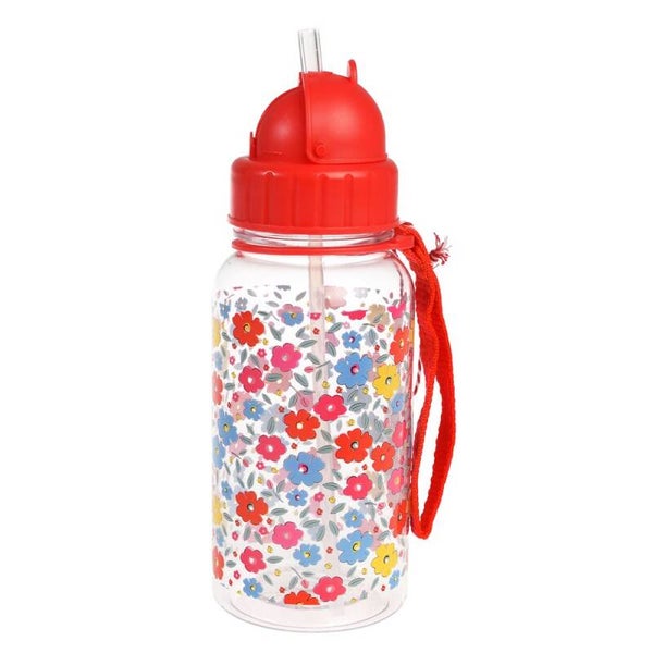 Children's water bottle with an integrated straw and nylon carry strap, decorated with our Tilde floral print.